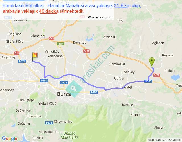 Barakfakih Mahallesi - Hamitler Mahallesi arası yaklaşık olarak 90 km/h ile yukarıda belirtilen sürede olup, iki yerin kuş uçuşu uzaklığı (mesafesi) 24'dir. Yolculuk otobüsle 52 dakika sürmektedir.