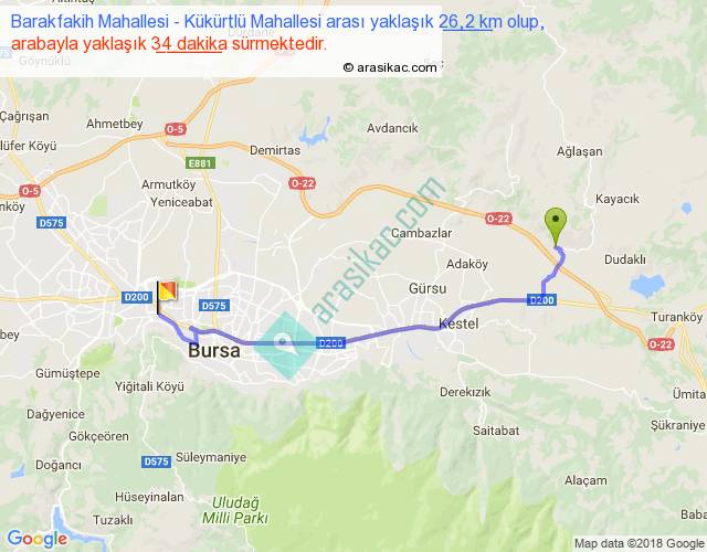 Barakfakih Mahallesi - Kükürtlü Mahallesi arası yaklaşık olarak 90 km/h ile yukarıda belirtilen sürede olup, iki yerin kuş uçuşu uzaklığı (mesafesi) 21'dir. Yolculuk otobüsle 44 dakika sürmektedir.