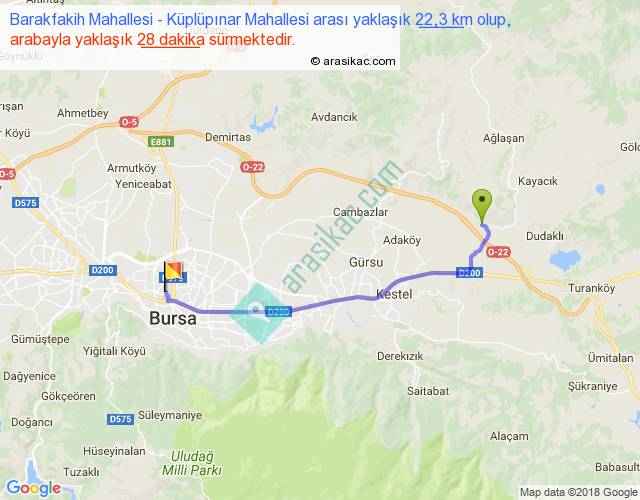 Barakfakih Mahallesi - Küplüpınar Mahallesi arası yaklaşık olarak 90 km/h ile yukarıda belirtilen sürede olup, iki yerin kuş uçuşu uzaklığı (mesafesi) 19'dir. Yolculuk otobüsle 36 dakika sürmektedir.