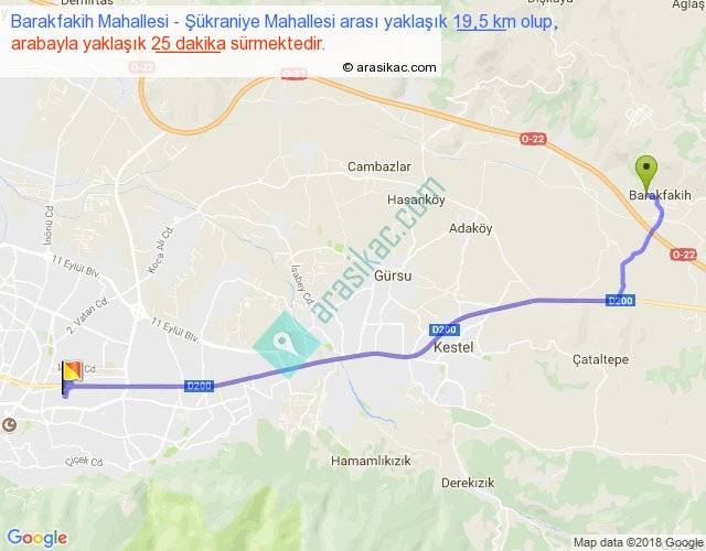 Barakfakih Mahallesi - Şükraniye Mahallesi arası yaklaşık olarak 90 km/h ile yukarıda belirtilen sürede olup, iki yerin kuş uçuşu uzaklığı (mesafesi) 16'dir. Yolculuk otobüsle 32 dakika sürmektedir.