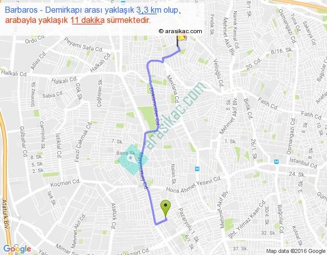 Barbaros - Demirkapı arası yaklaşık olarak 90 km/h ile yukarıda belirtilen sürede olup, iki yerin kuş uçuşu uzaklığı (mesafesi) 2'dir. Yolculuk otobüsle 14 dakika sürmektedir.