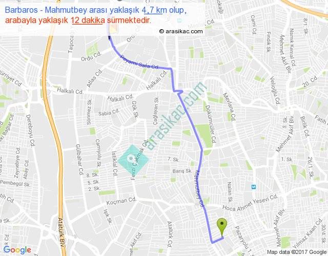 Barbaros - Mahmutbey arası yaklaşık olarak 90 km/h ile yukarıda belirtilen sürede olup, iki yerin kuş uçuşu uzaklığı (mesafesi) 3'dir. Yolculuk otobüsle 15 dakika sürmektedir.