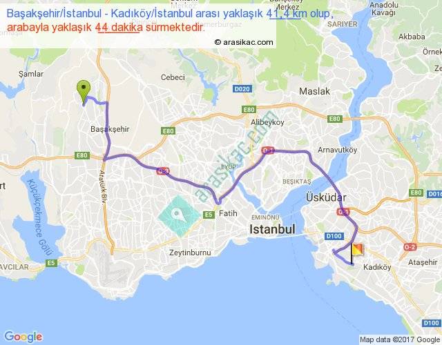 Başakşehir İstanbul - Kadıköy İstanbul arası yaklaşık olarak 90 km/h ile yukarıda belirtilen sürede olup, iki yerin kuş uçuşu uzaklığı (mesafesi) 26'dir. Yolculuk otobüsle 57 dakika sürmektedir.