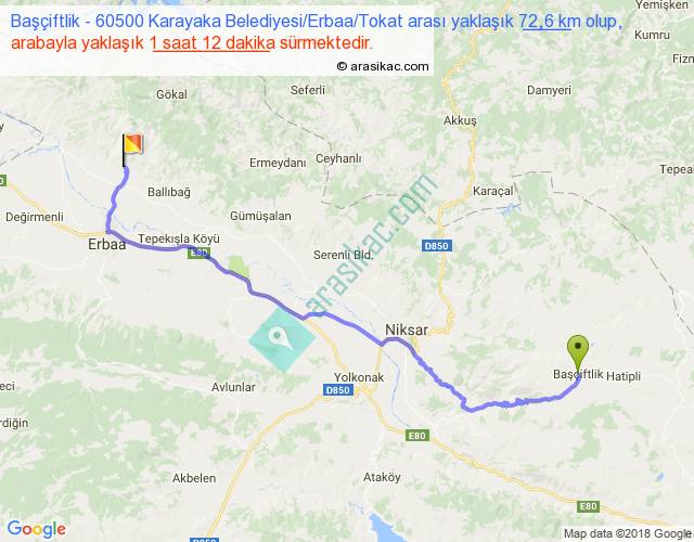 Başçiftlik - 60500 Karayaka Belediyesi Erbaa Tokat arası yaklaşık olarak 90 km/h ile yukarıda belirtilen sürede olup, iki yerin kuş uçuşu uzaklığı (mesafesi) 53'dir. Yolculuk otobüsle 1 saat 33 dakika sürmektedir.