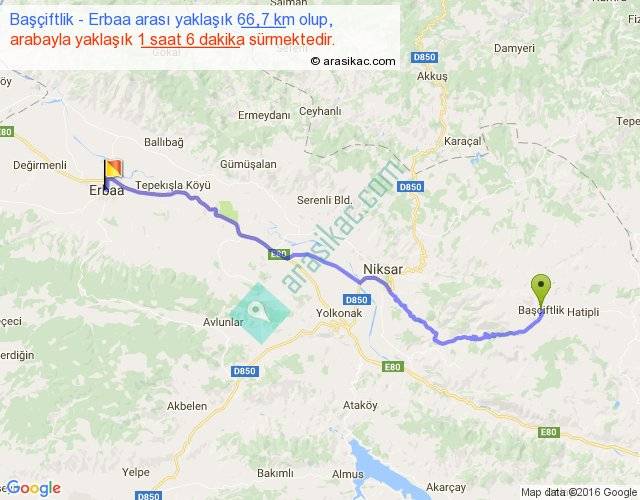 Başçiftlik - Erbaa arası yaklaşık olarak 90 km/h ile yukarıda belirtilen sürede olup, iki yerin kuş uçuşu uzaklığı (mesafesi) 52'dir. Yolculuk otobüsle 1 saat 25 dakika sürmektedir.