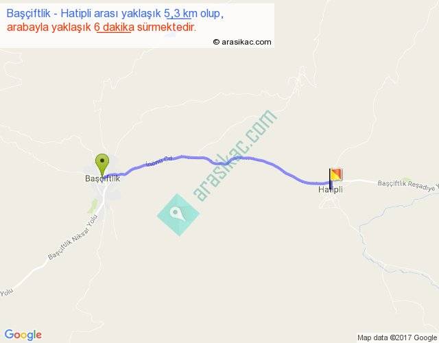 Başçiftlik - Hatipli arası yaklaşık olarak 90 km/h ile yukarıda belirtilen sürede olup, iki yerin kuş uçuşu uzaklığı (mesafesi) 5'dir. Yolculuk otobüsle 7 dakika sürmektedir.