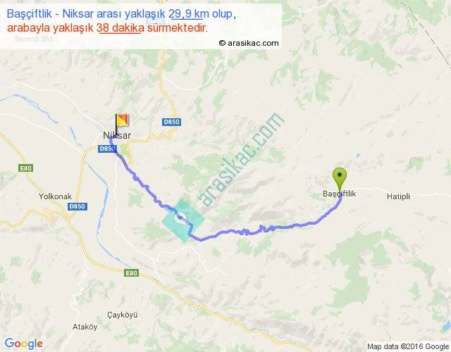 Başçiftlik - Niksar arası yaklaşık olarak 90 km/h ile yukarıda belirtilen sürede olup, iki yerin kuş uçuşu uzaklığı (mesafesi) 19'dir. Yolculuk otobüsle 49 dakika sürmektedir.