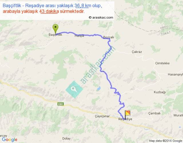 Başçiftlik - Reşadiye arası yaklaşık olarak 90 km/h ile yukarıda belirtilen sürede olup, iki yerin kuş uçuşu uzaklığı (mesafesi) 22'dir. Yolculuk otobüsle 55 dakika sürmektedir.