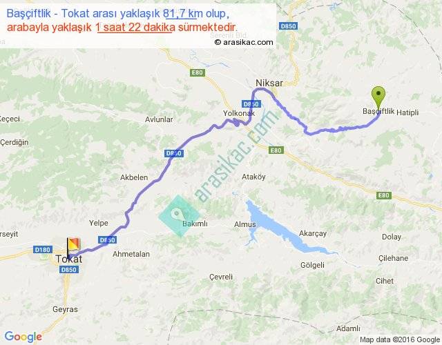 Başçiftlik - Tokat arası yaklaşık olarak 90 km/h ile yukarıda belirtilen sürede olup, iki yerin kuş uçuşu uzaklığı (mesafesi) 57'dir. Yolculuk otobüsle 1 saat 46 dakika sürmektedir.