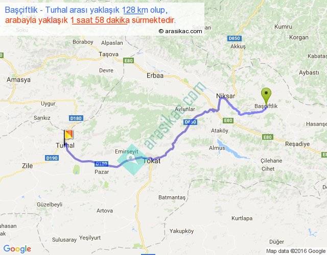 Başçiftlik - Turhal arası yaklaşık olarak 90 km/h ile yukarıda belirtilen sürede olup, iki yerin kuş uçuşu uzaklığı (mesafesi) 93'dir. Yolculuk otobüsle 2 saat 33 dakika sürmektedir.