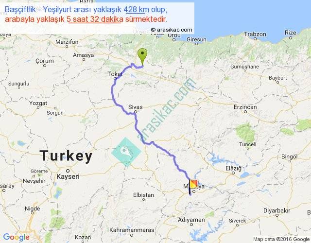 Başçiftlik - Yeşilyurt arası yaklaşık olarak 90 km/h ile yukarıda belirtilen sürede olup, iki yerin kuş uçuşu uzaklığı (mesafesi) 265'dir. Eğer belirtilen yerler arasında uçak seferi var ise bu süre uçakla 24 dakika'ya kadar düşebilir. Yolculuk otobüsle 7 saat 11 dakika sürmektedir.
