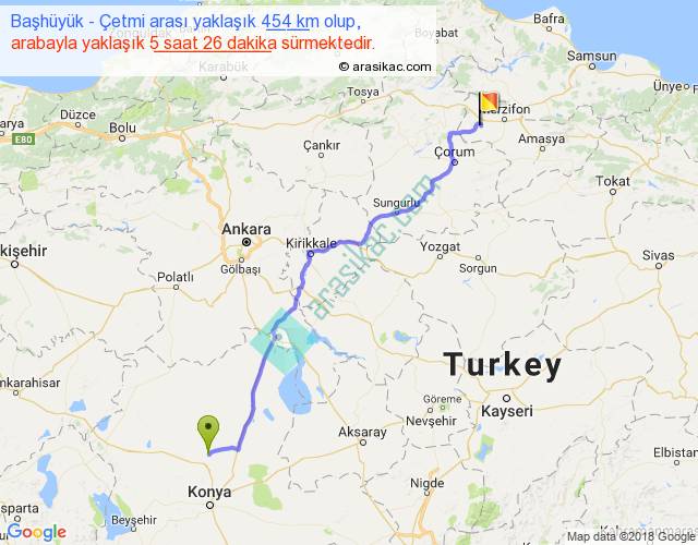 Başhüyük - Çetmi arası yaklaşık olarak 90 km/h ile yukarıda belirtilen sürede olup, iki yerin kuş uçuşu uzaklığı (mesafesi) 366'dir. Eğer belirtilen yerler arasında uçak seferi var ise bu süre uçakla 33 dakika'ya kadar düşebilir. Yolculuk otobüsle 7 saat 3 dakika sürmektedir.
