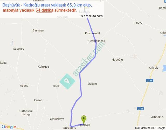 Başhüyük - Kadıoğlu arası yaklaşık olarak 90 km/h ile yukarıda belirtilen sürede olup, iki yerin kuş uçuşu uzaklığı (mesafesi) 52'dir. Yolculuk otobüsle 1 saat 10 dakika sürmektedir.