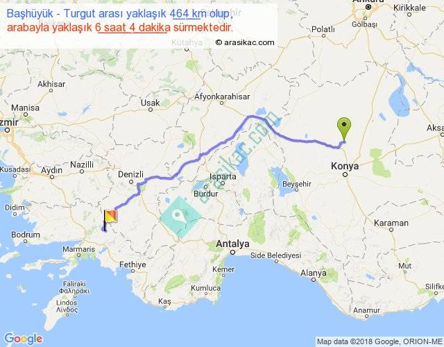 Başhüyük - Turgut arası yaklaşık olarak 90 km/h ile yukarıda belirtilen sürede olup, iki yerin kuş uçuşu uzaklığı (mesafesi) 353'dir. Eğer belirtilen yerler arasında uçak seferi var ise bu süre uçakla 32 dakika'ya kadar düşebilir. Yolculuk otobüsle 7 saat 53 dakika sürmektedir.