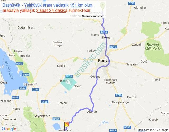 Başhüyük - Yalıhüyük arası yaklaşık olarak 90 km/h ile yukarıda belirtilen sürede olup, iki yerin kuş uçuşu uzaklığı (mesafesi) 113'dir. Yolculuk otobüsle 3 saat 7 dakika sürmektedir.