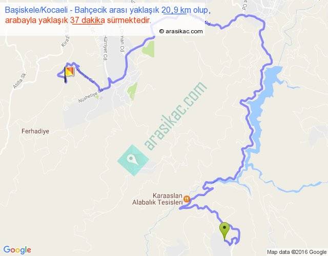 Başiskele Kocaeli - Bahçecik arası yaklaşık olarak 90 km/h ile yukarıda belirtilen sürede olup, iki yerin kuş uçuşu uzaklığı (mesafesi) 6'dir. Yolculuk otobüsle 48 dakika sürmektedir.