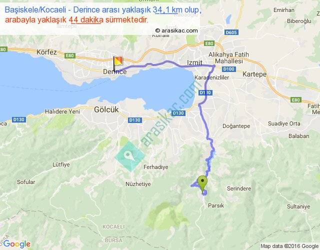 Başiskele Kocaeli - Derince arası yaklaşık olarak 90 km/h ile yukarıda belirtilen sürede olup, iki yerin kuş uçuşu uzaklığı (mesafesi) 17'dir. Yolculuk otobüsle 57 dakika sürmektedir.