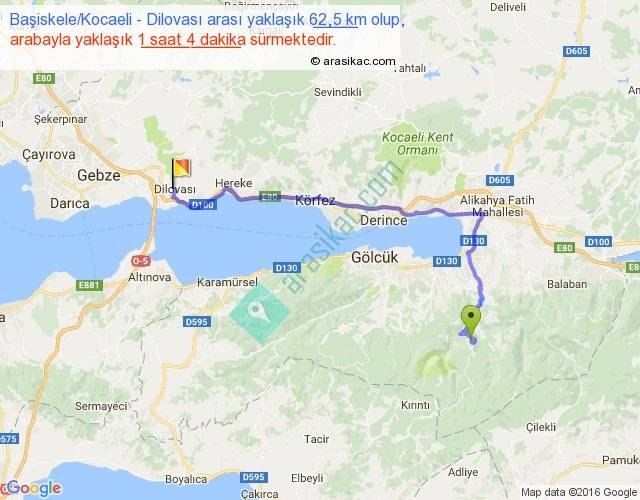 Başiskele Kocaeli - Dilovası arası yaklaşık olarak 90 km/h ile yukarıda belirtilen sürede olup, iki yerin kuş uçuşu uzaklığı (mesafesi) 38'dir. Yolculuk otobüsle 1 saat 23 dakika sürmektedir.