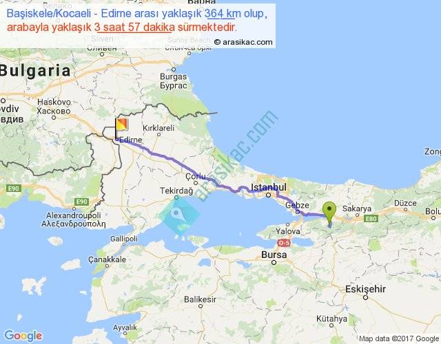 Başiskele Kocaeli - Edirne arası yaklaşık olarak 90 km/h ile yukarıda belirtilen sürede olup, iki yerin kuş uçuşu uzaklığı (mesafesi) 305'dir. Eğer belirtilen yerler arasında uçak seferi var ise bu süre uçakla 28 dakika'ya kadar düşebilir. Yolculuk otobüsle 5 saat 8 dakika sürmektedir.