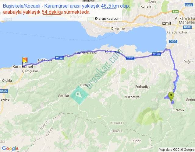 Başiskele Kocaeli - Karamürsel arası yaklaşık olarak 90 km/h ile yukarıda belirtilen sürede olup, iki yerin kuş uçuşu uzaklığı (mesafesi) 29'dir. Yolculuk otobüsle 1 saat 10 dakika sürmektedir.