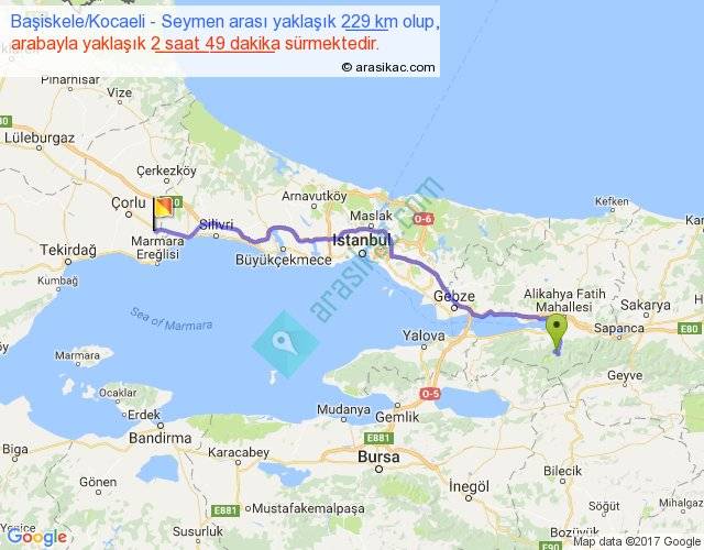 Başiskele Kocaeli - Seymen arası yaklaşık olarak 90 km/h ile yukarıda belirtilen sürede olup, iki yerin kuş uçuşu uzaklığı (mesafesi) 175'dir. Yolculuk otobüsle 3 saat 39 dakika sürmektedir.