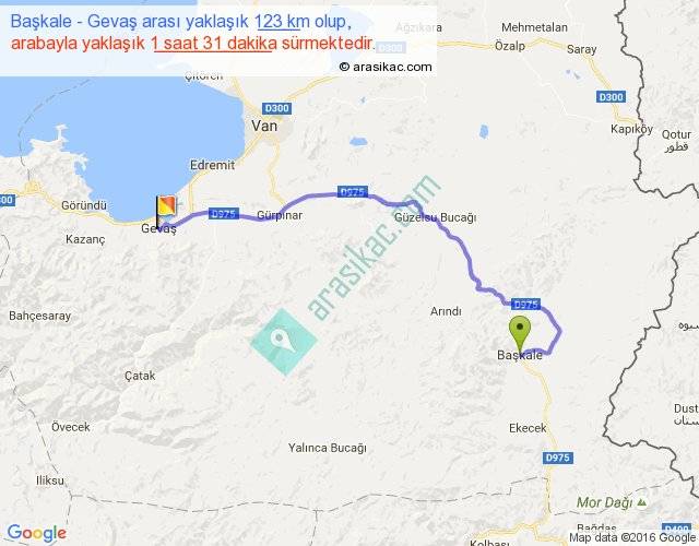 Başkale - Gevaş arası yaklaşık olarak 90 km/h ile yukarıda belirtilen sürede olup, iki yerin kuş uçuşu uzaklığı (mesafesi) 84'dir. Yolculuk otobüsle 1 saat 58 dakika sürmektedir.