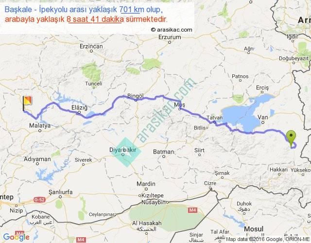 Başkale - İpekyolu arası yaklaşık olarak 90 km/h ile yukarıda belirtilen sürede olup, iki yerin kuş uçuşu uzaklığı (mesafesi) 529'dir. Eğer belirtilen yerler arasında uçak seferi var ise bu süre uçakla 48 dakika'ya kadar düşebilir. Yolculuk otobüsle 11 saat 17 dakika sürmektedir.