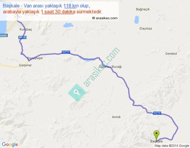 Başkale - Van arası yaklaşık olarak 90 km/h ile yukarıda belirtilen sürede olup, iki yerin kuş uçuşu uzaklığı (mesafesi) 75'dir. Yolculuk otobüsle 1 saat 57 dakika sürmektedir.