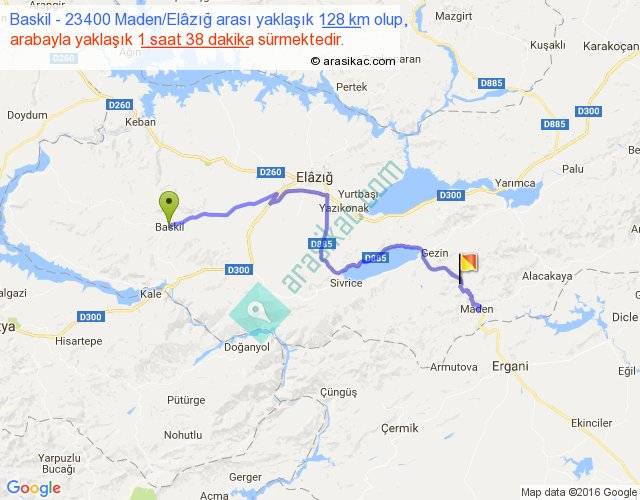 Baskil - 23400 Maden Elâzığ arası yaklaşık olarak 90 km/h ile yukarıda belirtilen sürede olup, iki yerin kuş uçuşu uzaklığı (mesafesi) 71'dir. Yolculuk otobüsle 2 saat 7 dakika sürmektedir.
