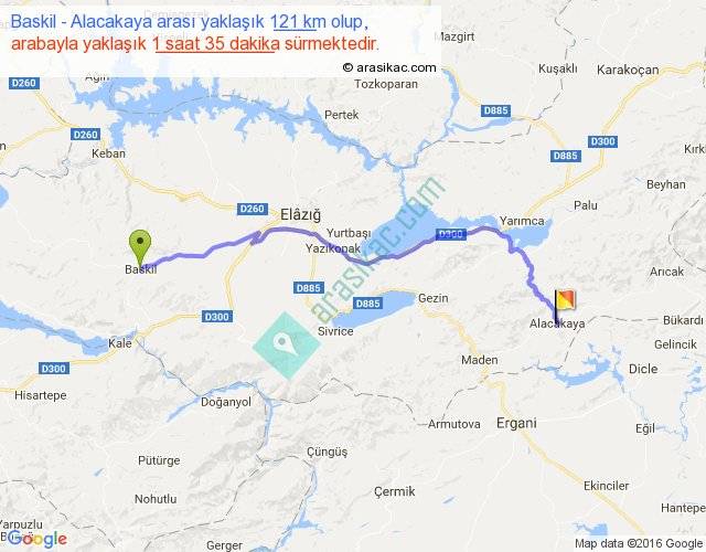 Baskil - Alacakaya arası yaklaşık olarak 90 km/h ile yukarıda belirtilen sürede olup, iki yerin kuş uçuşu uzaklığı (mesafesi) 91'dir. Yolculuk otobüsle 2 saat 3 dakika sürmektedir.