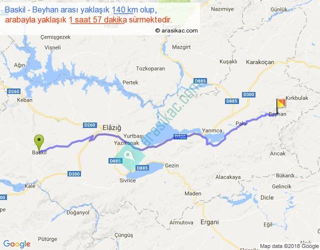 Baskil - Beyhan arası yaklaşık olarak 90 km/h ile yukarıda belirtilen sürede olup, iki yerin kuş uçuşu uzaklığı (mesafesi) 114'dir. Yolculuk otobüsle 2 saat 32 dakika sürmektedir.