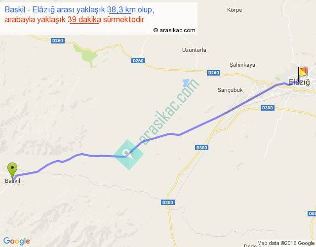 Baskil - Elâzığ arası yaklaşık olarak 90 km/h ile yukarıda belirtilen sürede olup, iki yerin kuş uçuşu uzaklığı (mesafesi) 36'dir. Yolculuk otobüsle 50 dakika sürmektedir.