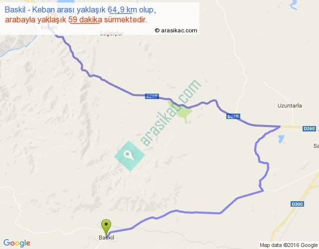 Baskil - Keban arası yaklaşık olarak 90 km/h ile yukarıda belirtilen sürede olup, iki yerin kuş uçuşu uzaklığı (mesafesi) 26'dir. Yolculuk otobüsle 1 saat 16 dakika sürmektedir.