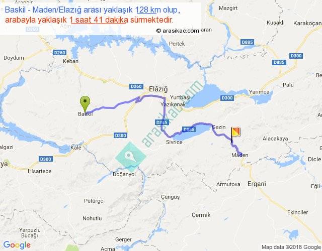 Baskil - Maden Elazığ arası yaklaşık olarak 90 km/h ile yukarıda belirtilen sürede olup, iki yerin kuş uçuşu uzaklığı (mesafesi) 71'dir. Yolculuk otobüsle 2 saat 11 dakika sürmektedir.