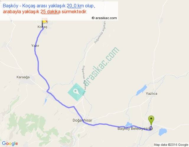 Başköy - Koçaş arası yaklaşık olarak 90 km/h ile yukarıda belirtilen sürede olup, iki yerin kuş uçuşu uzaklığı (mesafesi) 15'dir. Yolculuk otobüsle 32 dakika sürmektedir.