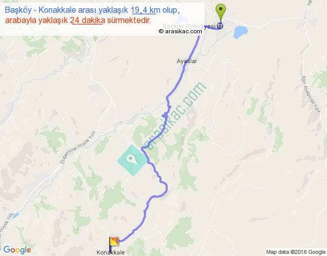 Başköy - Konakkale arası yaklaşık olarak 90 km/h ile yukarıda belirtilen sürede olup, iki yerin kuş uçuşu uzaklığı (mesafesi) 15'dir. Yolculuk otobüsle 31 dakika sürmektedir.