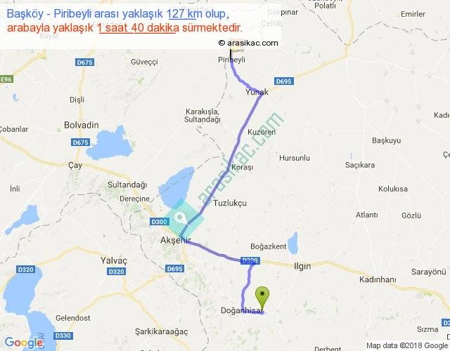 Başköy - Piribeyli arası yaklaşık olarak 90 km/h ile yukarıda belirtilen sürede olup, iki yerin kuş uçuşu uzaklığı (mesafesi) 86'dir. Yolculuk otobüsle 2 saat 10 dakika sürmektedir.