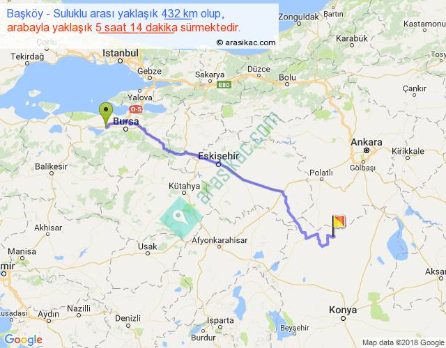 Başköy - Suluklu arası yaklaşık olarak 90 km/h ile yukarıda belirtilen sürede olup, iki yerin kuş uçuşu uzaklığı (mesafesi) 340'dir. Eğer belirtilen yerler arasında uçak seferi var ise bu süre uçakla 31 dakika'ya kadar düşebilir. Yolculuk otobüsle 6 saat 48 dakika sürmektedir.