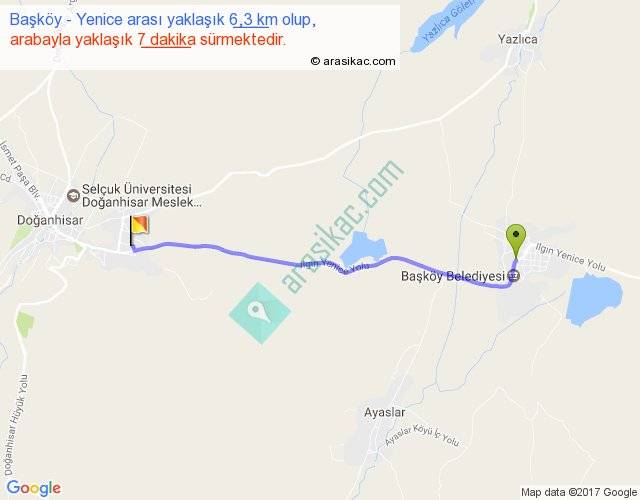 Başköy - Yenice arası yaklaşık olarak 90 km/h ile yukarıda belirtilen sürede olup, iki yerin kuş uçuşu uzaklığı (mesafesi) 6'dir. Yolculuk otobüsle 9 dakika sürmektedir.