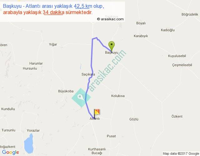 Başkuyu - Atlantı arası yaklaşık olarak 90 km/h ile yukarıda belirtilen sürede olup, iki yerin kuş uçuşu uzaklığı (mesafesi) 26'dir. Yolculuk otobüsle 44 dakika sürmektedir.