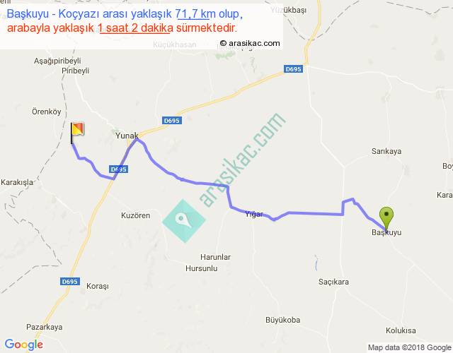 Başkuyu - Koçyazı arası yaklaşık olarak 90 km/h ile yukarıda belirtilen sürede olup, iki yerin kuş uçuşu uzaklığı (mesafesi) 55'dir. Yolculuk otobüsle 1 saat 20 dakika sürmektedir.