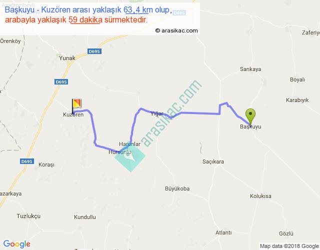 Başkuyu - Kuzören arası yaklaşık olarak 90 km/h ile yukarıda belirtilen sürede olup, iki yerin kuş uçuşu uzaklığı (mesafesi) 42'dir. Yolculuk otobüsle 1 saat 16 dakika sürmektedir.