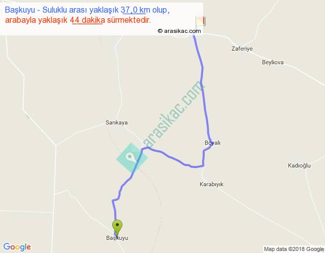 Başkuyu - Suluklu arası yaklaşık olarak 90 km/h ile yukarıda belirtilen sürede olup, iki yerin kuş uçuşu uzaklığı (mesafesi) 26'dir. Yolculuk otobüsle 57 dakika sürmektedir.