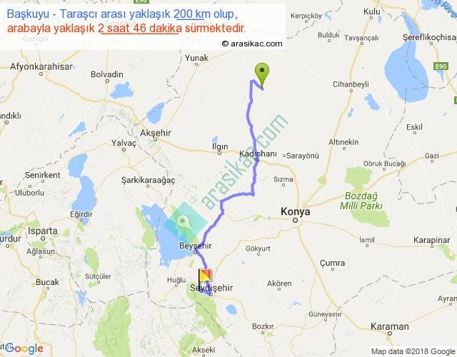 Başkuyu - Taraşcı arası yaklaşık olarak 90 km/h ile yukarıda belirtilen sürede olup, iki yerin kuş uçuşu uzaklığı (mesafesi) 142'dir. Yolculuk otobüsle 3 saat 35 dakika sürmektedir.