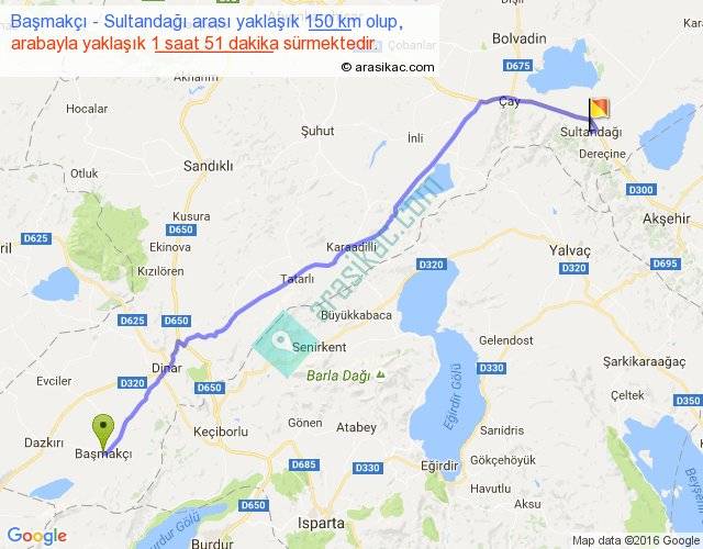 Başmakçı - Sultandağı arası yaklaşık olarak 90 km/h ile yukarıda belirtilen sürede olup, iki yerin kuş uçuşu uzaklığı (mesafesi) 127'dir. Yolculuk otobüsle 2 saat 24 dakika sürmektedir.
