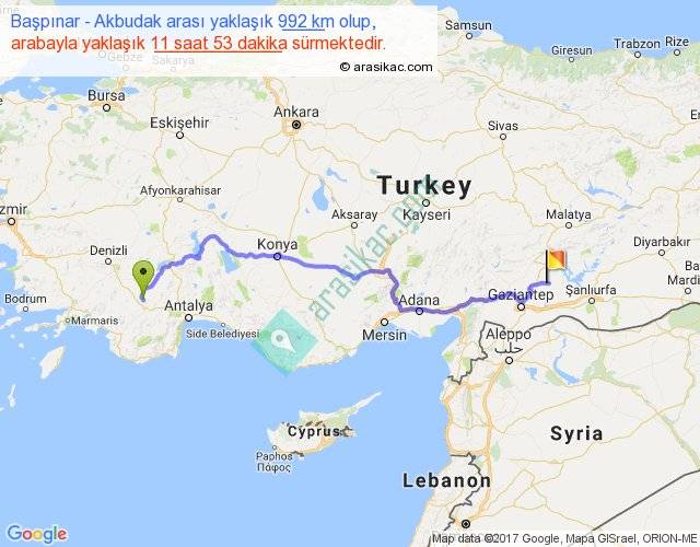 Başpınar - Akbudak arası yaklaşık olarak 90 km/h ile yukarıda belirtilen sürede olup, iki yerin kuş uçuşu uzaklığı (mesafesi) 690'dir. Eğer belirtilen yerler arasında uçak seferi var ise bu süre uçakla 1 saat 03 dakika'ya kadar düşebilir. Yolculuk otobüsle 15 saat 16 dakika sürmektedir.