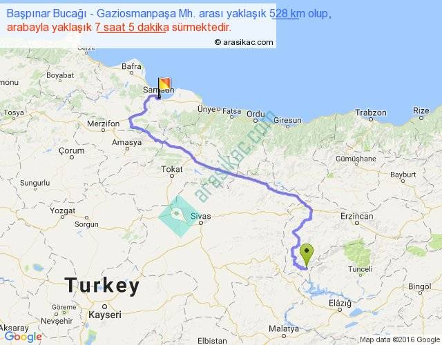Başpınar Bucağı - Gaziosmanpaşa Mh. arası yaklaşık olarak 90 km/h ile yukarıda belirtilen sürede olup, iki yerin kuş uçuşu uzaklığı (mesafesi) 302'dir. Eğer belirtilen yerler arasında uçak seferi var ise bu süre uçakla 27 dakika'ya kadar düşebilir. Yolculuk otobüsle 9 saat 12 dakika sürmektedir.