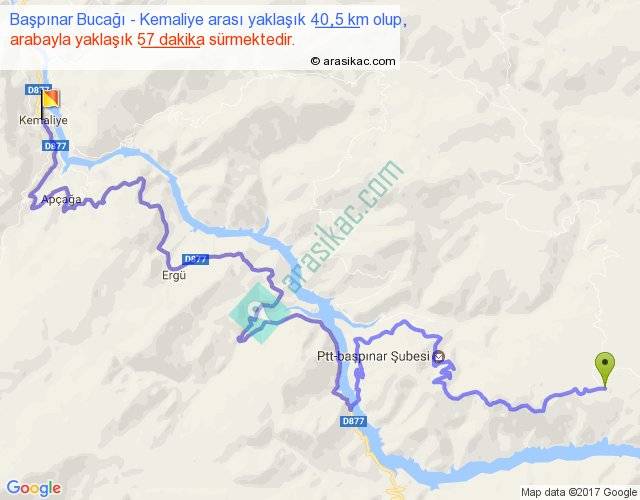 Başpınar Bucağı - Kemaliye arası yaklaşık olarak 90 km/h ile yukarıda belirtilen sürede olup, iki yerin kuş uçuşu uzaklığı (mesafesi) 18'dir. Yolculuk otobüsle 1 saat 14 dakika sürmektedir.