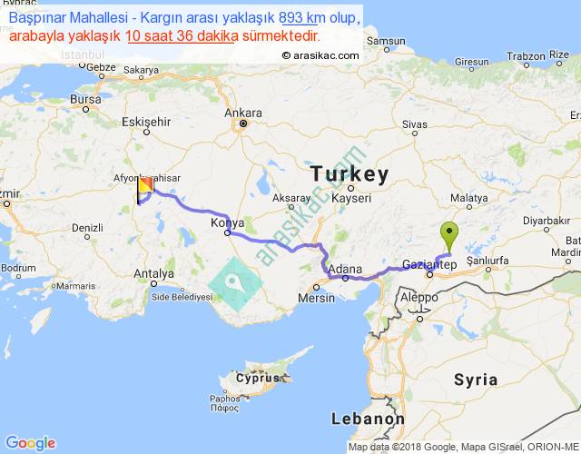 Başpınar Mahallesi - Kargın arası yaklaşık olarak 90 km/h ile yukarıda belirtilen sürede olup, iki yerin kuş uçuşu uzaklığı (mesafesi) 663'dir. Eğer belirtilen yerler arasında uçak seferi var ise bu süre uçakla 1 saat 01 dakika'ya kadar düşebilir. Yolculuk otobüsle 13 saat 46 dakika sürmektedir.