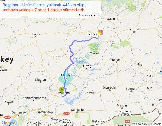 Başpınar - Üzümlü arası yaklaşık olarak 90 km/h ile yukarıda belirtilen sürede olup, iki yerin kuş uçuşu uzaklığı (mesafesi) 258'dir. Eğer belirtilen yerler arasında uçak seferi var ise bu süre uçakla 23 dakika'ya kadar düşebilir. Yolculuk otobüsle 9 saat 7 dakika sürmektedir.